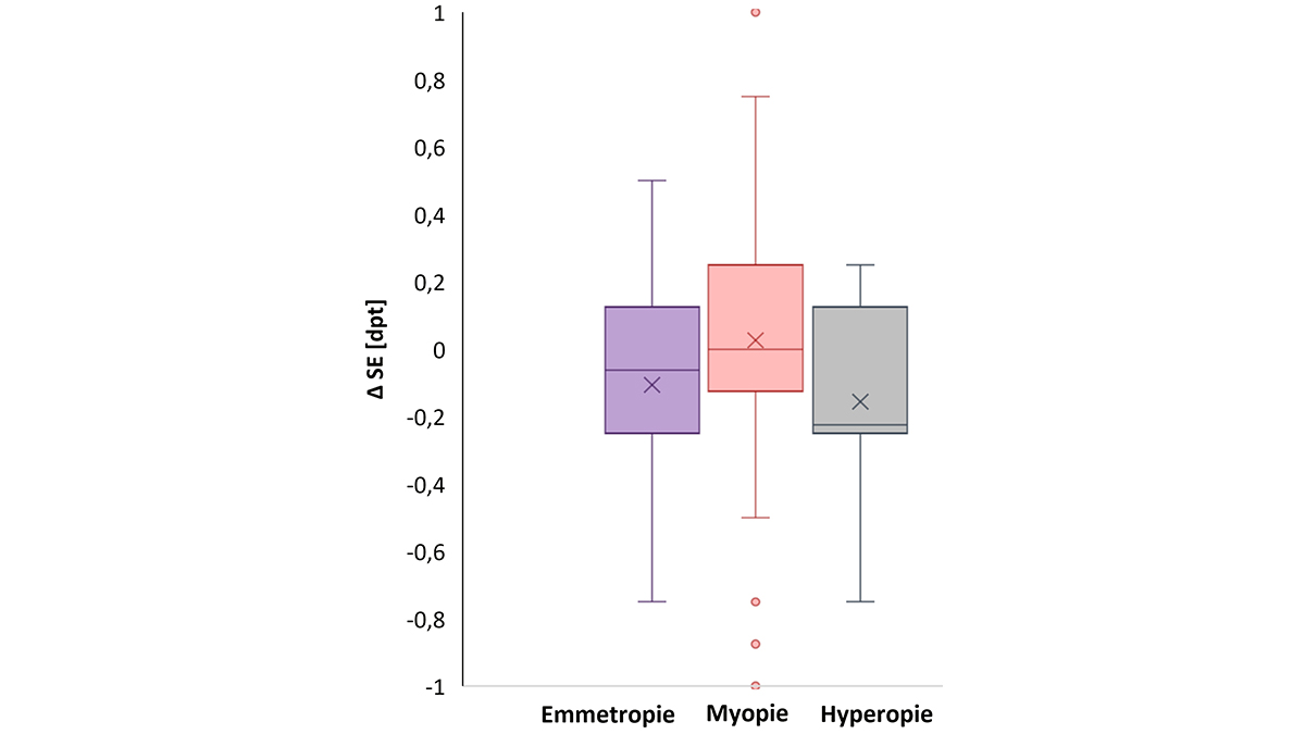 Um signifikante Unterschiede der Methoden zu konkretisieren, wurden die sphärischen Äquivalente SE nach Fehlsichtigkeiten eingeteilt und diese ebenfalls grafisch dargestellt. Hierbei wurden signifikante Unterschiede zwischen den Emmetropen und Hyperopen ersichtlich (Δ SE Emm: − 0,10 dpt, p = 0,002; Δ SE Myop: 0,02 dpt, p = 0,207; Δ SE Hyp: − 0,19 dpt, p = 0,004). In Abbildung 5 (s. Bildergalerie) werden die Differenzen (Δ SE = AB − SR) aufgetragen und die tendenziell negativer bestimmten SE-Korrektionswerte im AB-Modus ersichtlich.