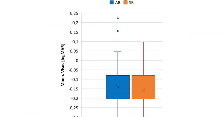 Abb. 7: Rechtes Auge: Vcc nach AB = – 0,14 ± 0,11 logMAR, Median = – 0,08; Vcc nach SR (konventionell) = – 0,16 ± 0,11 logMAR, Median = – 0,20. Anmerkung: ein Visus von 1,0 in dezimal entspricht in logMAR 0,00. Ist der Visus in Dezimalschreibweise >1, wird der logMAR-Wert <0.