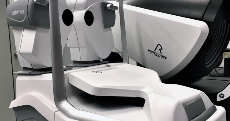 Objektive Messung; Wellenfronttechnologie: Vor der algorithmusbasierten subjektiven Refraktion wird eine objektive Refraktion durchgeführt. Diese erfolgt, wie auch beim DNEye Scanner2 (https:// www.rodenstock.de/de/de/dneye-scanner.html), nach dem Hartmann-Shack-Prinzip. Die Sensoren werden automatisch zentrisch zur Pupille positioniert und können zusätzlich manuell mittels Tablet gesteuert werden. Der Unterschied zum DNEye Scanner 2 liegt zum einen im Aufbau des Geräts (frontal geöffnet; Abb. 1) und zum anderen werden zwei Hartmann-Shack-Sensoren verwendet, die eine simultane und binokulare Messung ermöglichen. Das frontal geöffnete Design ermöglicht es dem Probanden, wie auch bei einem konventionellen Phoropter, den Blick auf ein tatsächlich in der Ferne liegendes Objekt zu richten. Hierzu wird ein Monitor in einem Abstand von mehr als 3 Metern zentrisch vor dem Gerät positioniert (Foto linke Seite).