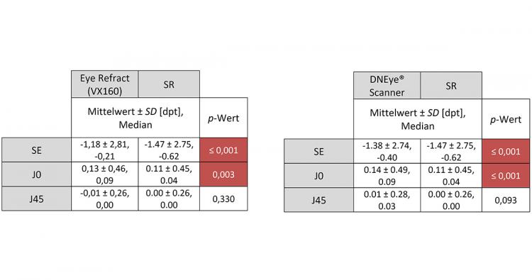 Ein Vergleich der beiden Wellenfrontergebnisse von Eye Refract und DNEye Scanner 2 mit den Ergebnissen der konventionellen subjektiven Refraktion zeigt sowohl für SE als auch J0 signifikante Unterschiede.