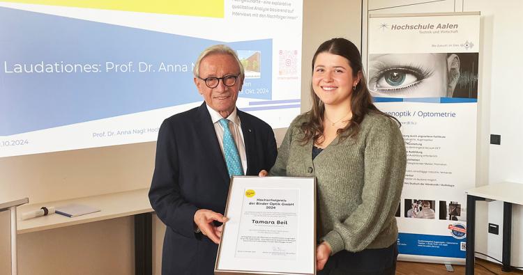 Dr. Helmut Baur, Geschäftsführender Gesellschafter der Binder Optik GmbH, überreichte den Binder Preis 2024 an die Gewinnerin und Bachelorabsolventin der Hochschule Aalen, Tamara Beil.