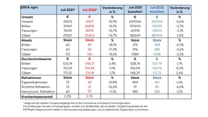 Schaut man sich den kumulierten Umsatz für das Jahr 2022 an, dann hängt der Umsatz um 0,6 Prozent dem aus den Monaten Januar bis Juli 2021 hinterher. Auch hier sanken die Stückzahlen (Brillen -4,3 %, Fassungen -3,6 %, Gläser -3,3 %) deutlicher als die Durchschnittswerte, die leicht im Plus liegen (Brillen +1,7 %, Fassungen +0,5 %, Gläser +2,6 %).