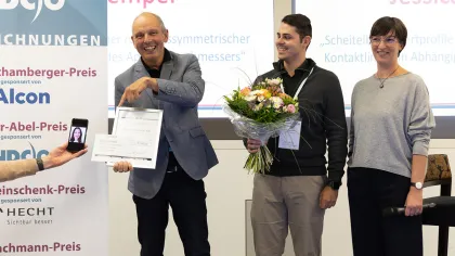 Rolf-Weinschenk-Preis: Jessica Kemper erhielt den Rolf-Weinschenk-Preis für ihr wissenschaftliches Poster zu Scheitelbrechwertprofilen weicher Kontaktlinsen. Ihre Ergebnisse tragen zur Optimierung der Kontaktlinsenanpassung bei und bieten Augenoptikern wichtige Einblicke in die optischen Eigenschaften von Kontaktlinsen. Der mit 500 Euro dotierte Preis wurde von Hecht Contactlinsen gesponsert.