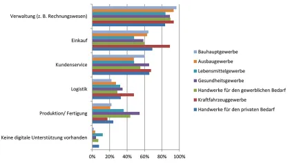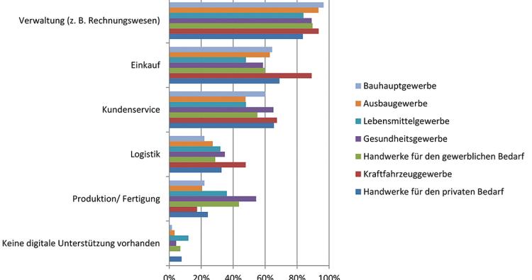 Im Vergleich mit anderen Gruppen des Handwerks werden in den Gesundheitshandwerken die meisten Anwendungen digital gestützter Geschäftsprozesse pro Unternehmen festgestellt. [2; 3] Der Prozess der Automatisierung und Digitalisierung sorgt in allen Gewerken für die Verdrängung charakteristischer handwerklicher Tätigkeiten und bewirkt den Einsatz zusätzlicher digitaler Mess- und Prüftechnik. [4] Für die Gesundheitshandwerke ist seit einigen Jahren insbesondere im Bereich der Produktion und Fertigung eine Vorreiterrolle wahrzunehmen (siehe Abb. 1).