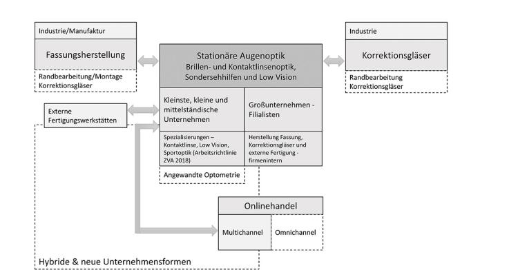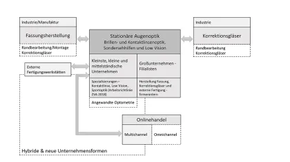 Faktoren wie Digitalisierung, Globalisierung der Märkte und Lifestyle haben zur Transformation der Unternehmensformen geführt, deren Wurzeln nicht mehr originär im Handwerk liegen. Somit werden sich die konkreten Arbeitsplätze der ausgebildeten Augenoptikerinnen in Zukunft deutlicher voneinander unterscheiden. Ausgehend von der stationären Augenoptik neben den Filialisten (vgl. Abb. 2) hat sich ein breites Feld an Unternehmensformen entwickelt, die ohne oder mit eingeschränkter stationärer Werkstatt arbeiten, die industriellen Ursprungs sind und verschiedene hybride Varianten mit dem Onlinehandel bilden. Weiterhin werden Spezialisierungen der Unternehmen deutlicher konzeptionell verankert. Darüber hinaus sind die Themen Nachhaltigkeit, Manufakturarbeit, schnellste Fertigung und handwerkliche Reparatur vor Ort ein Alleinstellungsmerkmal einzelner Unternehmen. Die angewandte Optometrie ist sowohl in traditionell handwerklichen Unternehmen als auch als Neugründung mit diesem Schwerpunkt inklusive interdisziplinären Kooperationen vorzufinden. [13; 16] Außerdem werden Augenoptikerinnen und Augenoptiker beispielsweise in den Praxen der Augenärzte und in feinwerktechnischen Berufen eingestellt. Die Ausbildung des Nachwuchses erfolgt derzeit allerdings ausschließlich in stationären Unternehmen mit ausbildungsadäquater Werkstatt.