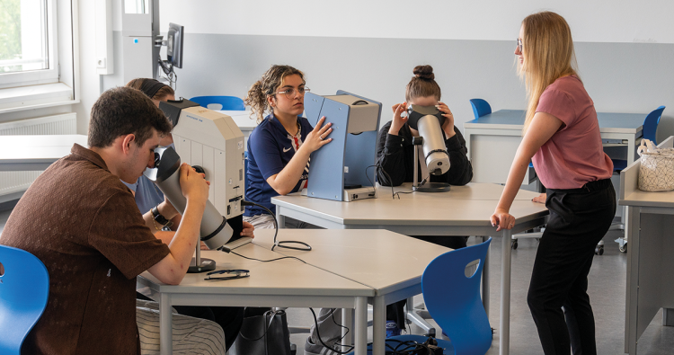 Lehrerin Susan Lorenz-Bombis lässt ihre Klasse im Labor die Wirkungsweise verschiedener Kontaktlinsen-Pflegemittel erforschen.