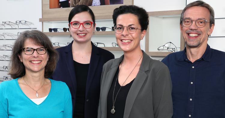 Gereon Müller, Inhaber von Optik Müller in Köln, mit seinem Team aus den drei Augenoptikermeisterinnen (v.l.) Anke Piepereit, Gülsah Adali und Esther Janitz.