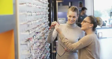 Beratungsgespräch zwischen Augenoptikerin und Kundin im Fachgeschäft