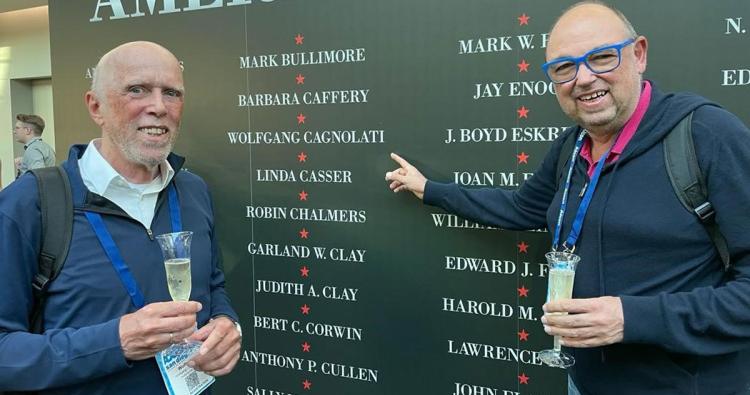 Als erster Kontinentaleuropäer wurde Wolfgang Cagnolati (l.) in die Hall of Fame der American Academy of Optometry aufgenommen. Zu den ersten Gratulanten vor Ort gehörte auch der Ehrenvorsitzende der VDCO Stefan Lahme.