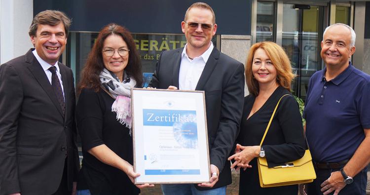 Roland Hausenbichler (Mi) erhält durch das Sabine Schlicht und Geschäftsführer RA Hartmut Glaser (li) von der WVAO in Anwesenheit der Vizebürgermeisterin Edith Lampert-Deuring und des WiGe-Obmann Manfred Böhmwalder (re) das Zertifikat mit der Auszeichnung "Gütesiegel Sehzentrum".