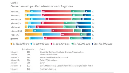 Eine Betrachtung der Betriebsgrößenklassen auf dieser Grundlage (siehe Grafik 1) zeigt, dass es innerhalb Deutschlands deutliche Unterschiede hinsichtlich der Umsatzgrößenverteilung der Betriebe gibt. Insbesondere in den Gebieten Nielsen 5 + 6 und 7 gibt es überproportional viele kleinere Betriebe. Der Anteil der Betriebe mit einem Netto-Jahresumsatz bis 250.000 Euro von 40 Prozent (Nielsen 5 + 6) und 54 Prozent (Nielsen 7) liegt deutlich über dem bundesweiten Durchschnitt von 28 Prozent. Umgekehrt liegt der Anteil der Betriebsstätten mit einem Jahresumsatz von 500.000 Euro netto und mehr in den Nielsengebieten 3b und 4 deutlich über dem Gesamtdurchschnitt.