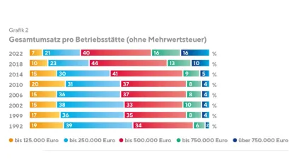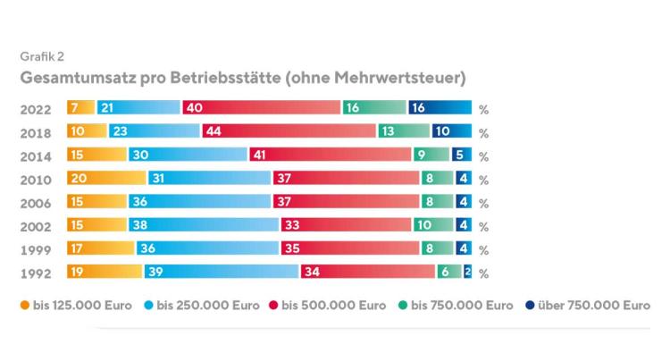 Seit dem Jahr 2014 gibt es deutliche Verschiebungen. Die kleinen Betriebsstätten gehen zurück, während die größeren Einheiten zunehmen. Erzielten im Jahr 2010 noch über die Hälfte der Betriebe (51 Prozent) einen Jahresumsatz bis 250.000 Euro, liegt dieser Anteil im Jahr 2022 nur noch bei 28 Prozent. Umgekehrt lag der Anteil der Betriebsstätten mit einem Jahresumsatz über 500.000 Euro im Jahr 2010 noch bei zwölf Prozent, während er im Jahr 2022 bei 32 Prozent liegt. Diese Veränderungen sind nicht mehr allein durch die Preissteigerungs- bzw. Inflationsrate zu erklären. Der durchschnittliche Nettoumsatz einer Betriebsstätte liegt im Jahr 2022 bei 473.875 Euro und damit um 19 Prozent über dem Wert von 2018. Seit 2014 ist der durchschnittliche Nettoumsatz pro Betriebsstätte um 41 Prozent gestiegen, während die Preissteigerungsrate in diesem Zeitraum bei 17 Prozent lag. Dies zeigt die deutlichen Verschiebungen in Richtung größerer Betriebsstätten, die über den Effekt der Preissteigerungsrate hinausgehen.