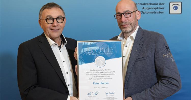 Peter Remm (r.) wurde vom ZVA für mehr als 25 Jahre ehrenamtliche Tätigkeit für die Augenoptiker-Innung Hannover mit dem ZVA-Ehrenzeichen in Silber geehrt.