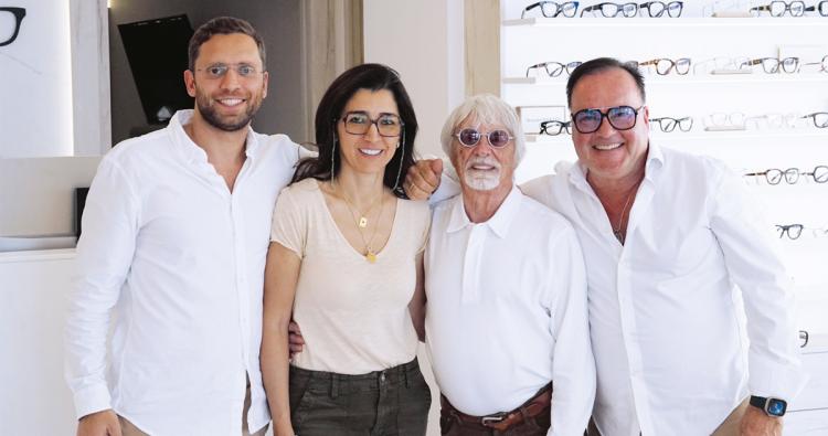 In seinem Geschäft „Óptica La Mar“ auf Ibiza begrüßt Georg Seidel (r.) viele Prominente – hier zum Beispiel den ehemaligen Formel-1-Boss Bernie Ecclestone (2. v. r.) und dessen Ehefrau Fabiana. Links Seidels Mitarbeiter Raoni Gabon.