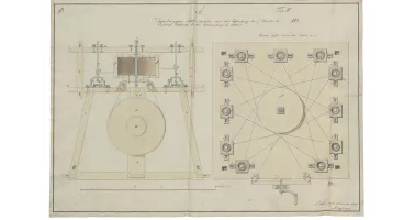 Konstruktionszeichnung der von Johann Heinrich August Duncker erfundenen Vielschleifmaschine aus dem Jahr 1800; abgebildet im Buch „Rathenow. Wiege der optischen Industrie“ aus dem Verlag für Berlin-Brandenburg, von dem noch einige wenige Exemplare verfügbar sind.