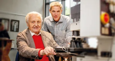Stecken Leidenschaft und Herzblut in den Brillenbau am Standort Münster: Frank Tente (rechts im Bild) und Heinz Michel, ein Brillenbauer der alten Schule. Auf dessen bejahrten Maschinen entstehen heute hochwertige Acetatfassungen.