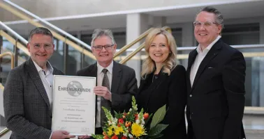 (v.l.n.r.) Vorsitzender der AOV Westfalen Thomas Heimbach mit Preisträger Friedhelm Hannig, Ute Limberg und Diethard Pankatz, Obermeister der AOI Westfalen.