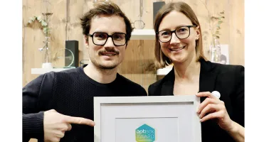 Stolz halten sie die Urkunde des „Opti Box Award” in die Höhe: Silvia Nadenbousch und Simon Krähenbühl, die frisch gekürten Co-Founder des Berner Start-ups. Ihre ganzheitliche Vision der Brille und ihres Unternehmens überzeugten die Fachjury.