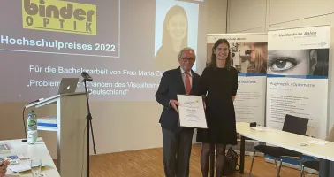 Maria Zinser untersuchte in ihrer Bachelorarbeit den aktuellen Stand des Visualtrainings in Deutschland und erhält dafür den Binder Optik Preis 2022, überreicht von Dr. Helmut Baur.
