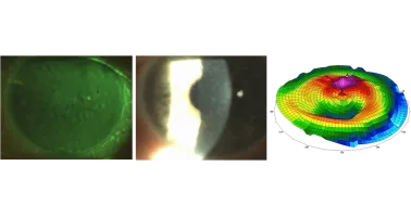 Abb. 3: Das linke Bild zeigt stromale Numulis OD > OS mit Golfball-ähnlichen Arealen mit Fluorescein-Pooling. Im mittleren Bild zeigt die Conjunctiva eine starke Hyperämie Grad 3 OU und rechts sieht man die entsprechende Topographie.