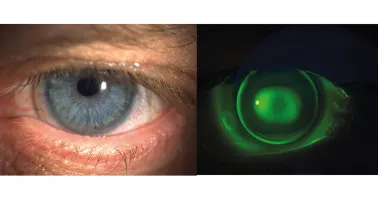 Links die zweite Messlinse mit einem zentralen Sitz; rechts eine zu eng angepasste RGP-Linse mit Stippungen
