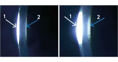 Abb. 11: Einstellung der spiegelnden Beleuchtung, Entstehung von zwei Reflexen am Epithel (1) und Endothel (2) (links); Abb. 12: Bessere Ausschnittsbeobachtung mit breiterem Spalt (rechts)