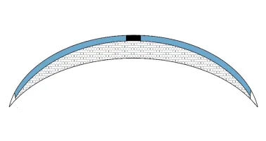 Der Querschnitt einer Irisprintlinse vereinfacht schematisch dargestellt. Der schwarze Bereich in der Mitte zeigt den nicht eingefärbten Bereich, durch den das Licht ins Auge gelangen kann. Die blauen Abschnitte sind die eingefärbten Bereiche der Kontaktlinse und das gitterartige Muster ist das restliche Material der Kontaktlinse.