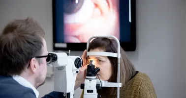 Anwendung der erlernten klinischen Untersuchungsverfahren im Kontaktlinsen-Labor an der Hochschule Aalen.
