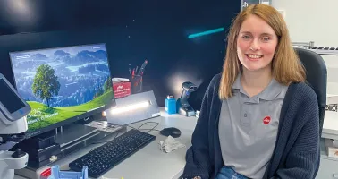 Augenoptikern Sarah Ertle kontrolliert als eine von drei Frauen die Qualität der Brillengläser. Nach zehn Jahren im Einzelhandel wechselte die 26-Jährige zur Industrie, weil sie eine neue Herausforderung suchte.