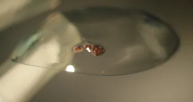 Mehrere Rostpartikel in einer weichen Kontaktlinse nach Metallbearbeitung ohne Arbeitsschutzbrille.