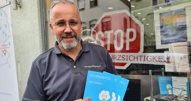 Robert Fetzer beschäftigt sich seit Jahren mit Myopie-Management, hält Vorträge und Schulungen und hat sein Schaufenster passend zum Thema „Stop Kurzsichtigkeit!“ gestaltet.