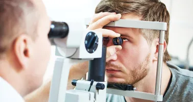 Ein Optometrist untersucht die Netzhaut seines Kunden.