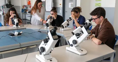 Lehrerin Susan Lorenz-Bombis lässt ihre Klasse im Labor die Wirkungsweise verschiedener Kontaktlinsen-Pflegemittel erforschen.