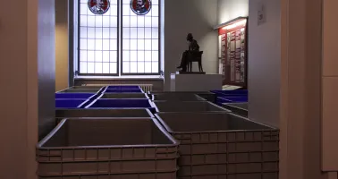 „Pass‘ ich rein oder nicht rein?“ scheint sich hier die Statue von Ernst Abbe am letzten Tag des Museumsumzugs ins Zwischenlager zu fragen. Im Sommer 2019 waren in den Rollcontainern zuvor tausende Ausstellungsstücke abtransportiert worden (auf den Bleiglasfenstern abgebildet links Ernst Abbe, rechts Carl Zeiss).